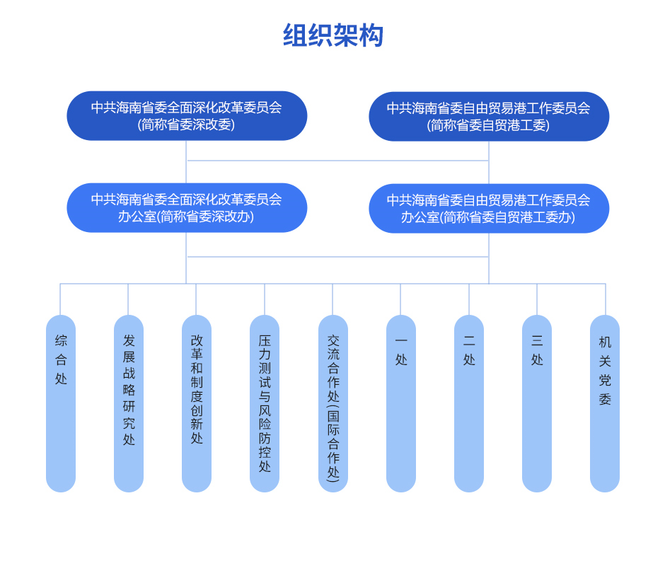 主要职责(一)贯彻落实党中央关于全面深化改革开放和自由贸易港建设的方针政策和省委决策部署,研究拟定并组织实施海南全面深化改革开放和自由贸易港建设中长期规划、政策措施和法规规章制度。