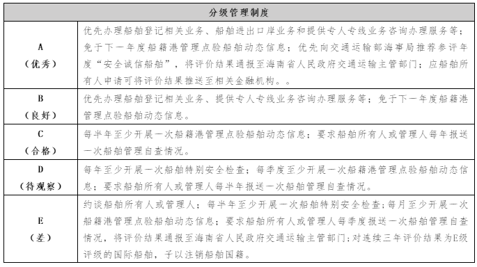 政策优势:为全面提升海南自由贸易港国际船舶安全管理效能,规范船舶综合质量评价管理,推动船舶质量整体提高,海南海事局出台《海南自由贸易港国际船舶综合质量评价管理办法》(以下简称《办法》),建立信息平台,将船舶质量、船员情况、企业安全和防污染管理等方面纳入指标体系进行分析和质量评价,并根据评价结果对船舶实施分级管理。海南自由贸易港国际船舶实施综合质量评价管理为全国首创。通过综合质量评价管理办法,引入退出机制,对连续三年评价结果为E级评级的国际船舶,予以注销船舶国籍。根据船舶质量评价结果对国际船舶实施分级管理的做法,可对船舶企业进行正向激励,对评价等级高的船舶企业采取政务服务、进出港方面等一系列便利高效措施,督促船东做好质量维护,有利于保障登记在“中国洋浦港”船籍港的船舶质量,提高国际认可度。